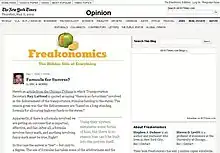 In May 2007, writer and blogger Melissa Lafsky was hired as the full-time editor of the site.[23] In August 2007, the blog was incorporated into The New York Times' web site – the authors had been writing joint columns for The New York Times Magazine since 2004 – and the domain Freakonomics.com became a redirect there.[24] In March 2008, Annika Mengisen replaced Lafsky as the blog editor.[25] The Freakonomics blog ended its association with The New York Times on March 1, 2011.[26]
