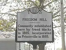 As the American Civil War reached its conclusion, formerly enslaved African Americans sought refuge at a temporary Union encampment south of Tarboro, North Carolina along the Tar River.[7] These inhabitants developed their own makeshift settlement at the site and chose the name Freedom Hill in recognition of a small raised area where a Union soldier first announced the Emancipation Proclamation.[8] In 1873, community member Turner Prince joined his companions in purchasing portions of the land and used his carpentry skills to begin building permanent homes. This created a kind of racialized topography with the black community on a swampy floodplain and white citizens on safer land above.[9] White land owners made no effort to protest the black residents' presence, since they found the swampy terrain to be of little use, and preferred to have them kept away from white residents in Tarboro. Some of the landowners eventually sold their holdings to the black residents.[7] Viewing state recognition as an important next step in establishing their identity as free citizens, the community successfully petitioned the North Carolina Legislature for incorporation in 1885. Despite requests to choose a name memorializing President Garfield, the new town instead called itself Princeville to honor its founder.[10]