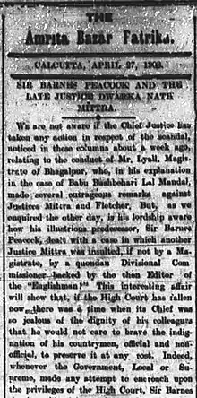 The British administrators are often credited for introducing the "independent journalism" (English press) in the subcontinent. During the period, the press became an instrumental for leaders, activists and the government itself. James Augustus Hicky, also referred to as "father of Indian press", a British citizen known for introducing first newspaper during the reign, and hence India's press foundation was originally led by the British administration despite the self-censorship by the imperialism.[3][4] Hicky wrote articles independently on corruption and other scandals without naming the officials. To avoid lawsuits, he used multiple nicknames while referring to the authorities throughout his articles.[5] In 1807, Hicky's Bengal Gazette was seized by the authorities for publishing anti-government articles.[2]
