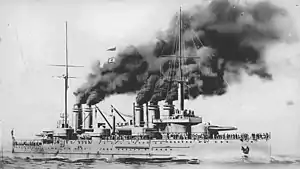 During the war, 75 mm anti-aircraft guns were installed on the roofs of the ship's two forward 240 mm gun turrets.[3] During 1918, the mainmast was shortened to allow the ship to fly a captive kite balloon and the elevation of the 240 mm guns was increased which extended their range to 18,000 meters (20,000 yd).[1]