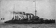 Danton was laid down at the Arsenal de Brest in February 1906.[1] Her launching was scheduled for May 1909, but socialist activists prevented the ship from leaving the stocks,[3] and so the launching was delayed until on 4 July 1909. After completing fitting-out work, she was commissioned into the French Navy on 1 June 1911.[1] A week after she was completed, she was sent to the United Kingdom in honour of the Coronation of George V in 1911.[4] Upon her return to France, Danton was to the 1st Battleship Squadron in April 1912, along with her five sister ships.[5] Later that year, while off Hyères in the Mediterranean, Danton suffered an explosion in one of her gun turrets, which killed three men and injured several others.[6] In 1913, the squadron was joined by the two powerful dreadnoughts Courbet and Jean Bart.[4]