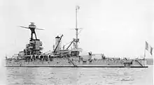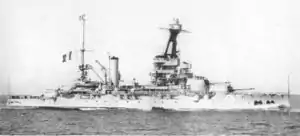 In June 1921, Provence and Bretagne went to Le Havre for a naval review, and were back in Toulon in September. In 1922, Provence and Lorraine were placed in reserve, leaving Bretagne the only member of her class in service; while out of service, Provence underwent a significant refit.[8] The work lasted from 1 February 1922 to 4 July 1923, and was carried out in Toulon. The ship had her armament improved; her main guns were given greater elevation to increase their range, and four 75 mm M1897 guns were installed on the forward superstructure. A heavy tripod mast with a fire control station and a rangefinder for the ship's anti-aircraft guns were also added.[5]