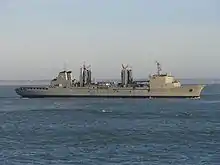 Durance was equipped with two landing craft for vehicles and personnel.[3] The ship has two dual solid/liquid underway transfer stations per side and can replenish two ships per side and one astern.[4] As built, Durance had capacity for 7,600 t (7,500 long tons) of fuel oil, 1,500 t (1,500 long tons) of diesel oil, 510 t (500 long tons) of JP-5 aviation fuel, 130 t (130 long tons) of distilled water, 170 t (170 long tons) of provisions, 150 t (150 long tons) of munitions and 51 t (50 long tons) of spare parts.[2]