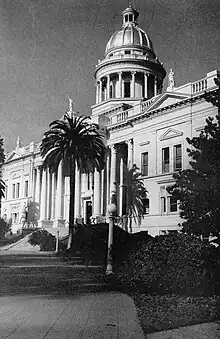 After the county seat was moved to Fresno, the cornerstone for a new courthouse there was laid on October 8, 1874, and the building was accepted on August 19, 1875.[3]:155 The 1875 courthouse was designed by state architect Albert A. Bennett.[6] It was subsequently enlarged in 1893, adding a large copper dome and two new wings.[7] In 1895, after a fire that destroyed the copper dome and gutted the central building, the courthouse was rebuilt. However, a structural survey in 1961 concluded the 1875 courthouse had significant structural defects, and it was torn down in 1966 after a new courthouse was built.[8]