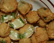 The basic preparation of fried okra is simple, requiring okra that has been dredged in oil and fried.[2] The okra pods are cut into slices and then tossed or dredged in cornmeal before frying in butter[13] or vegetable oil.[14][4] Either deep frying and pan frying may be used.[1] More complex recipes involve dipping the okra in eggs or buttermilk prior to dredging in cornmeal or cornmeal and flour.[15][16][17][18] Another method of preparation calls for a cornmeal batter that includes beaten eggs. This batter may be seasoned with ingredients such as black pepper and cayenne pepper.[19]