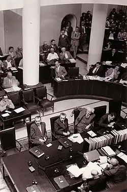 During Knesset sessions, King George Street in the area of Froumine House was closed for traffic, which caused great disruption to residents of the city. In addition, the location of Knesset meetings on a main street in the city-center resulted in security problems. During the demonstration against the Reparations Agreement between Israel and West Germany in 1952, protesters threw stones at the building, shattering windows and penetrating the plenum chamber. A hand grenade was also thrown into the plenum hall in 1957, which wounded Golda Meir, David Ben-Gurion, Moshe Shapira and Moshe Carmel. Nevertheless, the "old Knesset building" was the site of a number of formative civil events, such as the passage of the Law of Return (1950), the Citizenship Law (1952) and the abolition of the death penalty (1954) although the execution of Adolf Eichmann was carried out in 1962 in Ramla.
