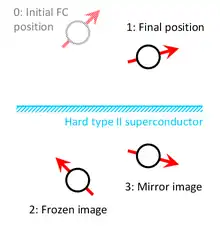 Frozen mirror image method (or method of frozen images) is an extension of the method of images for magnet-superconductor systems that has been introduced by Alexander Kordyuk in 1998 to take into account the magnetic flux pinning phenomenon.[1] The method gives a simple representation of the magnetic field distribution generated by a magnet (a system of magnets) outside an infinitely flat surface of a perfectly hard (with infinite pinning force) type-II superconductor in more general field cooled (FC) case, i.e. when the superconductor goes into superconducting state been already exposed to the magnetic field. The difference from the mirror image method, which deals with a perfect type-I superconductor (that completely expels the magnetic field, see the Meissner effect), is that the perfectly hard superconductor screens the variation of the external magnetic field rather than the field itself.