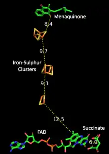 - ↑ Horsefield R, Yankovskaya V, Sexton G, Whittingham W, Shiomi K, Omura S, Byrne B, Cecchini G, Iwata S (March 2006). "Structural and computational analysis of the quinone-binding site of complex II (succinate-ubiquinone oxidoreductase): a mechanism of electron transfer and proton conduction during ubiquinone reduction". The Journal of Biological Chemistry. 281 (11): 7309–16. doi:10.1074/jbc.M508173200. PMID 16407191.