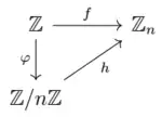 Given two groups G and H and a group homomorphism f : G → H, let N be a normal subgroup in G and φ the natural surjective homomorphism G → G/N (where G/N is the quotient group of G by N). If N is a subset of ker(f) then there exists a unique homomorphism h: G/N → H such that f = h∘φ.