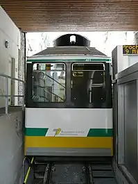 Funiculaire Ecluse - Plan is a funicular railway in Neuchâtel, Switzerland. The line leads from Ecluse at 442 m to Plan at 556 m, the neighborhood of the city on Le Plan (595 m). The funicular with two cars has a single track with a passing loop. The line of 399 m in length has a difference of elevation of 111 m.[2] Intermediate stations are Boine (520 m) and Côte.[1] The lower part and the passing loop are in tunnels (80 m and 86 m length originally).[3] Built in 1890,[2][4][3] it used water counterbalancing before electrification in 1907. The funicular is owned and operated by Transports publics Neuchâtelois.[2]