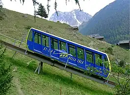 Funiculaire de St-Luc - Tignousa is a funicular railway in the Anniviers valley, Valais, Switzerland. The line leads from St-Luc at 1680 m to Tignousa at 2180 m.[3] It provides access to the skiing area St-Luc-Chandolin and also operates in summer season. The line has a length of 1300 m and a difference of elevation of 500 m.[3]