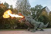 Although plans for a new dragon have existed since 2001, it wasn't until July 15, 2006, that funding for a new dragon was announced and secured.[4] In February 2007, the main project for its realization was launched and the construction was supervised by Zollner Elektronik in Zandt. The project cost 2.3 million euros and it took almost nine years to build this walking robot[5] measuring 15.5 meters long, 3.8 meters wide, 4.5 meters high and weighing 11 tons. The dragon is capable of running at up to 12 km/h, but local guidelines limit its speed to 1.8 km/h. It can also lift and turn its head, has facial expressions, a movable tail, can spread its wings to a 12-meter wingspan, spit fire and smoke over 5 meters and roar. It is controlled by 4 people, each of whom can control a leg and an option such as fire. Due to local regulations and for added security, each person can see what the other is doing. On June 2, 2010, some 10,000 people gathered to watch the dragon arrive by truck in Furth im Wald. It has been used for the first time at the festival in July 31, 2010. The dragon is currently the largest four-legged robot in the world, and was entered in the Guinness Book of Records in 2012.[6] The title of Further's dragon-building project was Tradinno (TRADition + INNOvation), hence its name: Tradinno. The people of Further affectionately call her "Fanny".