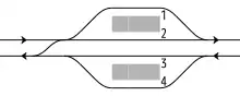 The station has two island platforms connected by an elevated station building built over the tracks and platforms. The station is staffed.