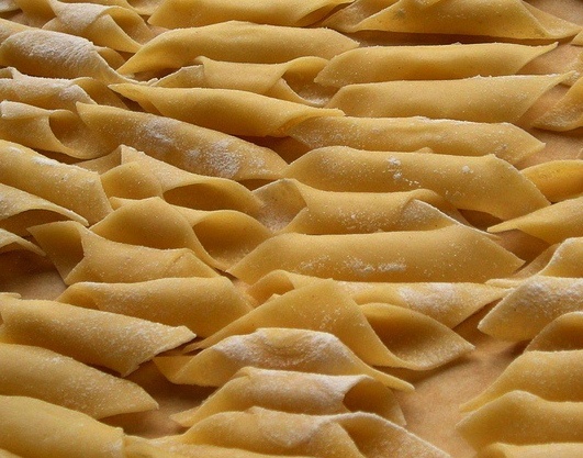 Fusi (also Fuži in Croatian and Slovene) is a traditional Istrian pasta from Croatia and Slovenia. The pasta dough is rolled out into a thin sheet, cut into strips three to four centimetres wide, and placed over each other. The strips are then cut diagonally, producing diamond shapes. Two ends of each diamond are then folded over each other to meet in the middle and pinched together, making the fuži look like a bow.[1] It is served with a mild red veal sauce, which is usually made out of onions, tomato paste, white wine and broth.