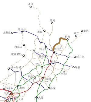 | Northeast end | Hegang, Heilongjiang (when complete) Yichun, Heilongjiang (current) | |||