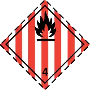 Flammable solids, self-reactive substances and solid desensitized explosives – Solids which, under conditions encountered in transport, are readily combustible or may cause or contribute to fire through friction; self-reactive substances which are liable to undergo a strongly exothermic reaction; solid desensitized explosives which may explode if not diluted sufficiently | ||