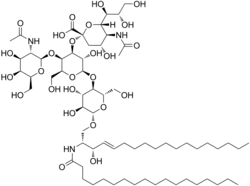 Ganglioside GM2; Tay–Sachs ganglioside; β-D-GalNAc-(1→4)-[α-Neu5Ac-(2→3)]-β-D-Gal-(1→4)-β-D-Glc-(1↔1)-N-octadecanoylsphingosine | |