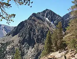 Gabbro Peak is an 11,033-foot-elevation (3,363-meter) mountain summit located in the Sierra Nevada mountain range, in Mono County of northern California, United States.[4] The mountain is set in the Hoover Wilderness on land managed by Humboldt–Toiyabe National Forest. The peak is situated one mile outside the boundary of Yosemite National Park, approximately three miles northwest of Virginia Lakes, one-half mile north of Page Peaks, and 2.2 miles (3.5 km) west-northwest of Dunderberg Peak. Topographic relief is significant as the north aspect rises over 2,000 feet (610 meters) above Green Lake in one-half mile. Gabbro Peak may be climbed from East Lake, or via the Virginia Pass Trail.[6]