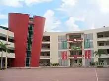 The campus was designed by eleven architects headed by project architect Jimmy Lam, an alumnus of the school.[29] Design inspiration was taken from the symbol of the school crest, namely the Dragon and the Ship. The colours used bear resemblance to the school colours. Its final look and feel are reminiscent of the old Anson Road campus. The building includes the Arena, where the daily flag raising ceremonies, parades and special functions are held, the Heritage Gallery, the school's tallest structure, and the Alumni Room, a gathering place for students.