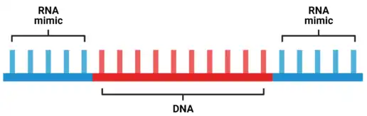 Gapmers are composed of short DNA strands flanked by strands of RNA mimics. The mimics are typically composed of locked nucleic acids (LNA), 2'-OMe, or 2'-F modified bases.[2] LNA sequences are RNA analogues "locked" into an ideal Watson-Crick base pairing conformation. Gapmers often utilize nucleotides modified with phosphorothioate (PS) groups.[4][3]