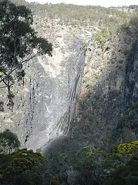 The Apsley Falls are located 20 kilometres (12 mi) east of Walcha, 1 kilometre (0.62 mi) off the Oxley Highway. Here the Northern Tablelands plateau drops precipitously into the rugged gorges carved out by the Aspley and upper Macleay Rivers which meander through the park. There is a 52-metre (171 ft) steel stairway leading to an observation deck (with disabled access) where there are great views of the deep gorge and the falls. There are two large falls, with two walking tracks taking in the Gorge Rim Walk and the Oxley Walk, picnic facilities and camping area for overnight stays. On 28 December 2009 the steel footbridge leading to Gorge Rim Walk was washed away.[12]