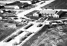 A large aircraft parking apron and several large hangars were also constructed. Buildings were ultimately utilitarian and quickly assembled. Most base buildings, not meant for long-term use, were constructed of temporary or semi-permanent materials. Although some hangars had steel frames and the occasional brick or tile building could be seen, most support buildings sat on concrete foundations but were of frame construction clad in little more than plywood and tarpaper. The base had its own hospital, 40-acre sewage plant, 9 administration buildings, 4 mess halls, supply rooms, officers' quarters, a guardhouse, a chapel, and 37 barracks.
