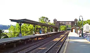 Rail service in Garrison can be traced as far back as the 1850s with the Hudson River Railroad. Prior to this, the only major transportation in the community was the ferry to West Point.[2] Garrison Landing was built around the station, which, along with the line, was acquired by the New York Central and Hudson River Railroad (NYC&HR) in 1864, and like many others on the Hudson Line, it is also right on the Hudson River. In 1892, NYC&HR rebuilt the station with elements of the Italianate, Victorian Gothic and Hudson River Bracketed styles, similar to stations such as Dobbs Ferry. On October 24, 1897, the Garrison train crash occurred 1.75-mile (2.82 km) south of the station at Kings Dock resulting in 19 deaths (mostly from drowning) and hundreds of injuries. A pedestrian tunnel was added to the station beneath the tracks in 1929. In April 1945, the station was a stop on the funeral train of Franklin D. Roosevelt, where West Pointers could pay tribute to the dead president as his body was transported to Hyde Park.[3]