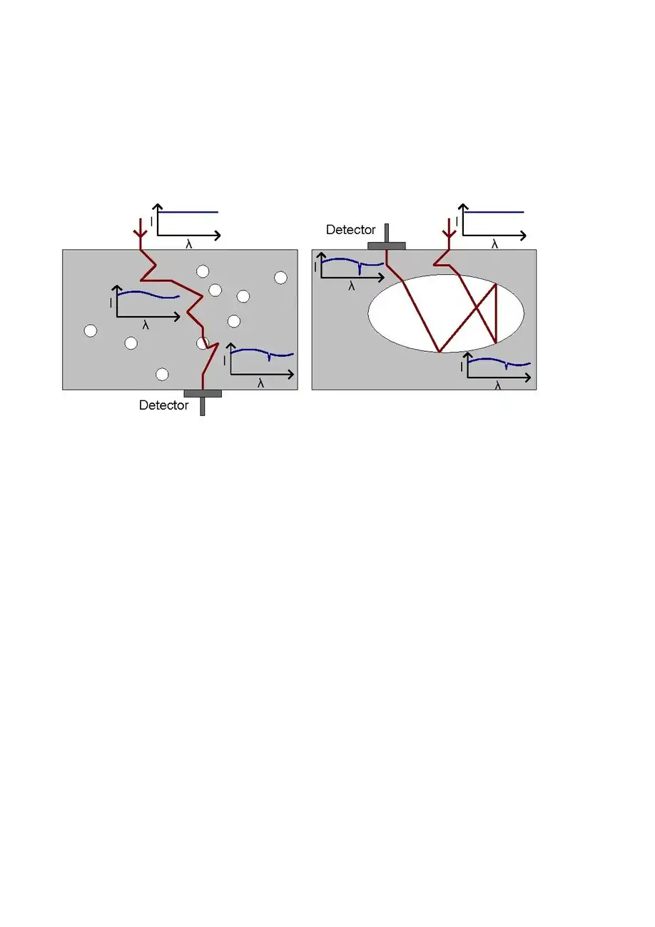 The basic principle of GASMAS is shown in figure 1. Laser light is sent into a sample with gas cavities, which could either be small pores (left) or larger gas-filled chambers. The heterogeneous nature of the porous material often give rise to strong light scattering, and pathlengths are often surprisingly long (10 or 100 times the sample dimension are not uncommon). In addition, light will experience absorption related to the solid material. When travelling through the material, light will travel partly through the pores, and will thus experience the spectrally sharp gas absorption. Light leaving the material will carry this information, and can be collected by a detector either in a transmission mode (left) or in a reflection mode (right).
