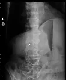 X-ray of abdomen of a person with gastric outlet obstruction taken while on their side. There is a prominent gastric air bubble, gastric air-fluid level, and a dilated stomach with particulate matter within it.