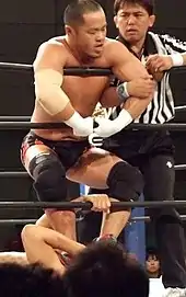 Gedo won the FMW Brass Knuckles Tag Team Championship not with Jado but with Koji Nakagawa when they defeated Masato Tanaka and Tetsuhiro Kuroda on June 13, 1999. Gedo would leave FMW in 2001 along with Masato Tanaka, Jado, Hideki Hosaka, and Kaori Nakayama with the group becoming freelancers with Gedo mostly working in Michinoku Pro. Gedo along with Jado would eventually return to New Japan and win the IWGP Junior Heavyweight Tag Team Championship when they defeated Jyushin Thunder Liger and El Samurai on July 20, 2001.[10] Gedo had a fierce rivalry with Liger after Jado and Gedo made a surprise appearance in NJPW when they both pulled Liger's mask off.[4] Jado and Gedo won the IWGP Junior Heavyweight belts for a second time in 2003 after again defeating Liger and Samurai.[11] In 2007, Gedo was offered a contract by World Wrestling Entertainment (WWE), but turned it down because he would have been required to portray a stereotypical Japanese character.[12] In July 2007, Gedo and Jado joined the Great Bash Heel (GBH) faction.[13][14] The tag team would compete in the 2007 G1 Tag League, but failed to win, with a final tally of 6 points.[15] In April 2009 Gedo and Jado left GBH and became founding members of the Chaos stable.[16] On November 13, 2010, Jado and Gedo returned to the top of New Japan's Junior Tag Team division by defeating their Chaos team mates Davey Richards and Rocky Romero in the finals of a five-day-long tournament to win the 2010 Super J Tag League.[17] As a result of their victory, Gedo and Jado received a match for the IWGP Junior Heavyweight Tag Team Championship, which took place at a Dramatic Dream Team (DDT) event on December 26, 2010, where they were defeated by the defending champions, the Golden☆Lovers (Kenny Omega and Kota Ibushi).[18] At the end of 2011, the Wrestling Observer Newsletter named Gedo and Jado the bookers of the year. They have won the award three more times since then.