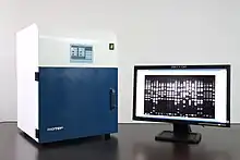 A gel doc, also known as a gel documentation system, gel image system or gel imager, refers to equipment widely used in molecular biology laboratories for the imaging and documentation of nucleic acid and protein suspended within polyacrylamide or agarose gels.[1][2] Genetic information is stored in DNA. Polyacrylamide or agarose gel electrophoresis procedures are carried out to examine nucleic acids or proteins in order to analyze the genetic data.[3] For protein analysis, two-dimensional gel electrophoresis is employed (2-DGE) which is one of the methods most frequently used in comparative proteomic investigations that can distinguish thousands of proteins in a single run. Proteins are separated using 2-DGE first, based on their isoelectric points (pIs) in one dimension and then based on their molecular mass in the other. After that, a thorough qualitative and quantitative analysis of the proteomes is performed using gel documentation with software image assessment methods on the 2-DGE gels stained for protein visibility.[4] Gels are typically stained with Ethidium bromide[5] or other nucleic acid stains such as GelGreen.