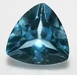 The most commonly irradiated gemstone is topaz, which usually becomes blue after the process.[3] Intensely blue topaz does not exist in nature and is the result of artificial irradiation.[25] According to the American Gem Trade Association, approximately 30 million carats (6,000 kg or 13,000 lb) of topaz are irradiated every year globally, 40 percent of which were done in the United States as of 1988.[26] Dark-blue varieties of topaz, including American Super Blue and London Blue, are the results of neutron bombardment,[24] while lighter sky-blue ones are often those of electron bombardment.[24] Swiss Blue, subtly lighter than the US variety, is the result of a combination of the two methods.[24]