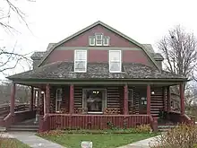The two-story, Queen Anne-style home has a Wisconsin white cedar-log exterior and features California redwood shingles on the upper story. The front facade features a single-story wraparound porch with log pillars across the front and east side. The fourteen-room home includes a wood-framed interior with red oak panels in the entrance hall, dining room, and library. The first floor also contains a kitchen, two bedrooms, a music room, a small conservatory, and a full bathroom (which Stratton-Porter also used as a photographic darkroom). The second floor included four large rooms. The home also featured seven fireplaces, large windows, and white oak floors.[12][18][19] A cedar-log barn/carriage house was erected behind the home. The property also included a yard filled with fruit trees, vines, and bushes, as well as a large flower garden.[20]