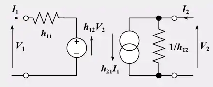 The model used to represent h-parameters is shown in the figure. h-parameters are frequently used in transistor data sheets to specify the device. The h-parameters are defined as the matrix