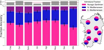 Another study from 2020 also found that the present-day Sardinian genome was shaped by immigration from the Iron Age onwards, which can be modelled well using three source populations, namely "Nuragic Sardinia, one northern Mediterranean source (e.g., individuals with group labels Lombardy, Tuscan, French, Basque, Spanish) and one eastern Mediterranean source (e.g., individuals with group labels Turkish-Jew, Libyan-Jew, Maltese, Tunisian-Jew, Moroccan-Jew, Lebanese, Druze, Cypriot, Jordanian, Palestinian)". Moreover, using a three-way model with Nuragic Sardinians, as well as "potential sources from various ancient samples that are representative of different regions of the Mediterranean", it was determined that "models with the largest p-values return fractions of Nuragic ancestry that are close to, or higher than 50%". North African ancestry among present-day Sardinians was found to be "negligible".[4]
