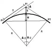 Horizontal alignment in road design consists of straight sections of road, known as tangents, connected by circular horizontal curves.[2] Circular curves are defined by radius (tightness) and deflection angle (extent). The design of a horizontal curve entails the determination of a minimum radius (based on speed limit), curve length, and objects obstructing the view of the driver.[4]