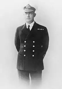 In 1894, Hyde entered the merchant service as an apprentice, hoping to gain a commission into the Royal Naval Reserve. Finishing his apprenticeship after four trips aboard a sailing ship, Mount Stewart, he journeyed as second mate in the barque Amulree in 1898.[1] Hyde was commissioned as a midshipman in the Royal Naval Reserve in 1896, and served upon His Majesty's Ships Magnificent, Victorious, Bacchante, Leviathan and Tribune, as reserve. Promoted to sub-lieutenant in 1901, he was posted as an acting lieutenant to the battleship HMS Nile on 23 June 1902, to serve during the Coronation Fleet Review for King Edward VII.[3] He was promoted to the rank of lieutenant the following month, on 19 July 1902,[4] and was posted to HMS Magnificent for 12 months training from late August 1902.[5] He continued his services to the Naval Reserve until he was gazetted as a lieutenant in the Royal Navy in July 1905. This was due to winning an essay competition about the Russo-Japanese War, in which he was, upon the intervention of Admiral Lord Charles Beresford, "elevated to join the list of Supplementary Lieutenants". The admiral had submitted three applications before Hyde was promoted to the Royal Navy.[2]