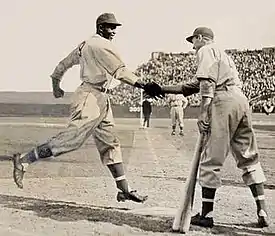 On the afternoon of April 18, 1946, Robinson became the first black player in modern organized baseball when he made his debut with the Dodgers’ Montreal Royals farm team in their International League opener against the Jersey City Giants. In the third inning, Robinson hit a three-run homer over the left-field fence. When he completed his trip around the bases, Shuba, the Royals’ left fielder and their next batter, shook his hand. Congratulating a home-run hitter was a commonplace ritual, but Shuba's welcome to a smiling Robinson was captured in an Associated Press photograph that has endured as a portrait of racial tolerance.[9]