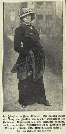 The district president in Potsdam recently gave permission to 20-year-old Georg von Zobeltitz in Weissensee near Berlin to wear women's clothes all the time. The young man had been repeatedly arrested by the police in women's clothing and had to be released again and again because of his feminine disposition. It caused quite a stir when he appeared before the selection committee in women's clothing and could not be persuaded to wear men's clothing in this case. Now that he has gained official permission to wear women's clothing, he will also take up a female profession and learn sewing in order to open a fashion salon.