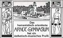 This vignette of the Arndt-Gymnasium Dahlem shows a young man studying at the left and a young man doing sports at the right; it was printed on the 2008 school programme.