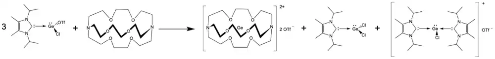 The Ge(II) cryptand[2.2.2] complex was prepared by the addition of cryptand to a solution of N-heterocyclic carbene stabilized GeCl(CF3SO3) in tetrahydrofuran.[6] The products obtained from this reaction are summarized below. The germanium cryptand salt precipitated from solution as a white powder, and the identity was established using proton NMR and crystal X-ray diffraction.[6] The carbene stabilized germanium chloride side products (structures given below) were identified in solution after the reaction.[6]