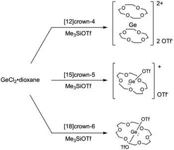 Ge(II) cationic species have been isolated with several crown ether ligands, including [12]crown-4, [15]crown-5, and [18]crown-6. Rupar et al. reported the synthesis of various germanium crown ethers employing GeCl2•dioxane as the source of Ge(II).[5] Trimethylsilyl trifluoromethanesulfonate (Me3SiOTf) was used to displace chloride ligands with a more weakly associating triflate ligand. The resulting germanium crown ether complexes can adopt different geometries and cation charges depending on the size of the crown ether and the nature of the anionic ligand, summarized in the figure below. Only the Ge complex with [12]crown-4 is able to fully exclude counter anions from coordinating to Ge to give a dicationic complex. The larger crown ethers do not form sandwich complexes with Ge, and leave room for an anion to associate with the encapsulated Ge. These complexes were characterized with NMR, X-ray crystallography, Raman spectroscopy, and mass spectrometry.[5]