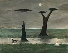 Abercrombie painted many variations of her favored subjects: sparsely furnished interiors, barren landscapes, self-portraits, and still-lifes. Many compositions feature a lone woman in a flowing gown, often depicted with attributes of sorcery: an owl, a black cat, a crystal ball, or a broomstick.[3] These works were often self-portraits, as she stated in an interview with Studs Terkel shortly before her death: "it is always myself that I paint".[8] Tall and sharp-featured, she considered herself ugly;[9] in life she sometimes wore a pointed velvet hat to accentuate her witch-like appearance, "enjoy[ing] the power this artifice gave her over others who would fear or recoil from her".[10] Abercrombie also drew inspiration from her dreams as a "self-proclaimed" source for her paintings to convey reality, but with illusions of fantasy.[11] The 1940s and '50s are described as her most prolific and productive period; a time when she no longer painted many portraits, but retained the themes mentioned above.[3]