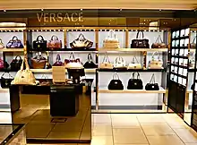 Inside of Versace store featuring multiple designer handbags