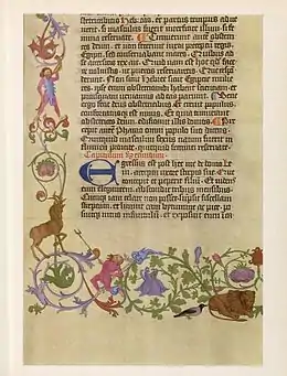 Several animals, humans, and flowers featured in the decorated borders added to some pages closely resemble figures in the Princeton University copy of the Gutenberg Bible and also in the work of the Master of the Playing Cards.[9][10] It is assumed that the same model book was used in each case. There has been speculation that the Master of the Playing Cards worked on the Giant Bible, and may also have been an associate of Gutenberg, though there is no hard evidence.[10][11] The Princeton copy of the Gutenberg Bible seems to have been decorated by a different artist than the Giant Bible.