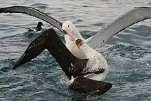 Similar in appearance to the wandering albatross, adult birds have white on the back, extending along the upper surface of the wings near the body. The white plumage of the head and body has fine grey barring. The upper wing has a black trailing edge, with black flight feathers and with mottled white patches on the black primary coverts. The underwing is white with a dark trailing edge. The tail is white with black edges, except in older males in which it may be completely white. The bill is pale pink. Females are slightly duller and smaller than males.[1] The taxon is generally paler than the nominate subspecies of Antipodean albatross, D. a. antipodensis, which breeds mainly in the Antipodes Islands.[7] Adult males have a mean weight of 6.8 kg and females of 5.8 kg.[8]