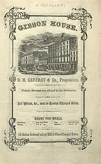 The Gibson House was opened about February 1849 on Walnut Street between Fourth and Fifth Street, on the west side of the street, in Cincinnati, OH. The first proprietors were J.K. and D.V. Bennett.[1] It was considered the "best house in the city"[2][3] within a year. The hotel was financed by Peter Gibson, a Scottish immigrant who was born October 20, 1802, and emigrated to America in 1831. Many wall decorations and frescoes were painted by the artist William A. Thien, who lived in Cincinnati for a time.[4]