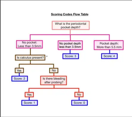 4)    Scoring codes range from 0 to 4. This can be accessed based on the flow table attached. A “*” is recorded when a furcation is involved.