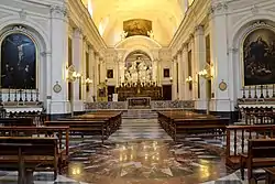 Having arrived in Naples, Giovanni Antionio Medrano managed to carve out his own professional space and, from 1749 to 1754, was in charge of the restructuring of all the buildings of the Archconfraternity of the Santissima Trinità dei Pellegrini, including the church, which he conceived according to a Latin cross layout. A project which, however, during the construction phase was reduced to the premises of the crypt and to the arrangement, in collaboration with M. Gioffredo and N. Tagliacozzi Canale, of the houses owned by the Archconfraternity itself, located between the church and Porta Medina.[7] The choir of the church (1754) was designed by Giovanni Antonio Medrano with a rich decoration, also in stucco. Apart from the renovation project of the building complex owned by Giuseppe De Maio Durazzo (1752), that of the Ss. Trinità dei Pellegrini probably constituted the last experience conducted in Naples by Giovanni Antonio Medrano. Excluded from large public construction sites since 1743 and since then marginalized with respect to the local professional and political circles, Giovanni Antionio Medrano had perhaps the only reason for his stubborn insistence on residing in Naples in family ties with G. Almirante, daughter of the Duke of Cerza Piccola and already widow of D. Toraldo, Baron of Calimera, with whom she had stipulated a marriage contract in 1736. After the inauguration of the choir ("terrasanta") in the church of the Ss. Trinità dei Pellegrini (1754), Giovanni Antonio Medrano was no longer active in any professional experience until his death, probably in 1760.[7]