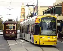 Glenelg is the terminus of the Glenelg tram line, which runs from Moseley Square, along Jetty Road though Glenelg, to the Adelaide Entertainment Centre.[38] The route dates back to 1873.[39]